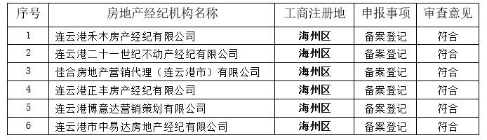 连云港市房地产经纪机构备案登记审查意见公示(2018年第7批)