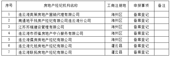 连云港市房地产经纪机构备案登记审核结果公告(2018年第4批)