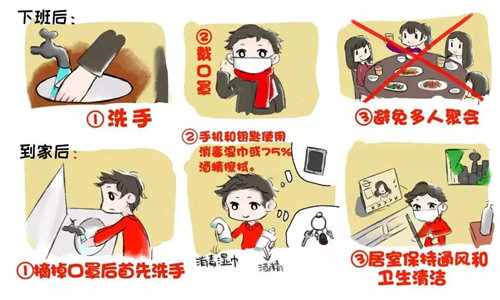 保持办公区环境清洁,建议每日通风3次,每次20-30分钟,通风时注意保暖。人与人之间保持1米以上距离,多人办公时佩戴口罩。保持勤洗手、多饮水,坚持在进食前、如厕后按照六步法严格洗手。接待外来人员双方佩戴口罩。